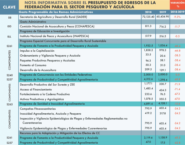 In the 2019 Federation Expenditure Budget, recently approved by the Chamber of Deputies of the Congress of the Union, Conapesca and Inapesca reduced their budget for administrative expenses by 11% and the Education and Research Program by 0.3% respectively compared to what was allocated the previous year.