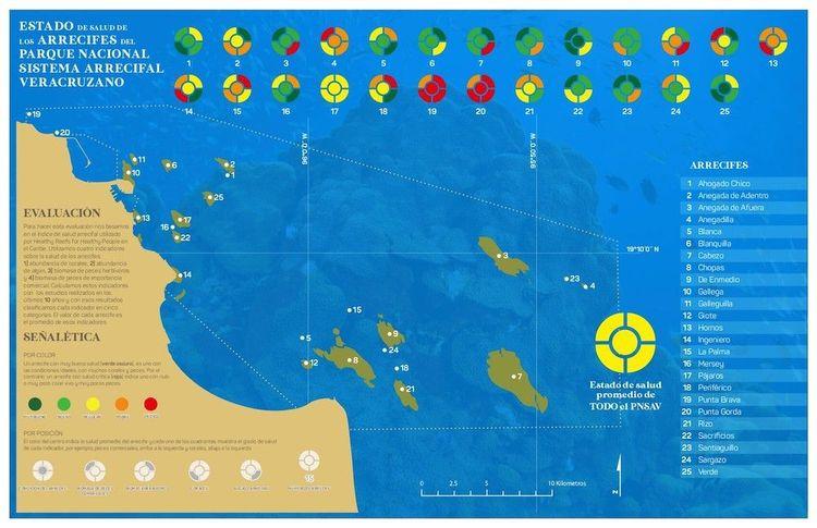 The results showed that the reef sites close to the coast in the Veracruz-Boca del Rio corridor, the closest to the wastewater discharge points, are those with the highest degree of deterioration.
