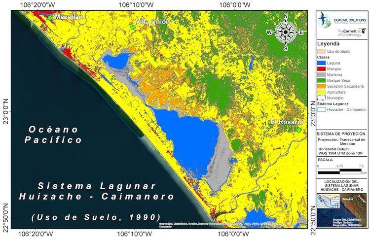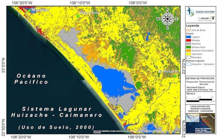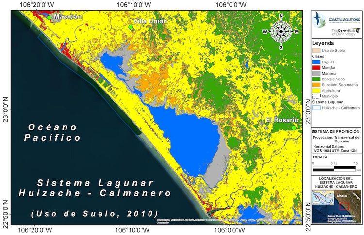 The Huizache Caimanero has been designated a Ramsar site since 2007 because of its importance for migratory birds in Mexico. Its registration form mentions that this coastal lagoon became the most productive in the Mexican Pacific with daily catches of 5.3 tons of shrimp and a historical record of 32 tons in a single day in 1983.