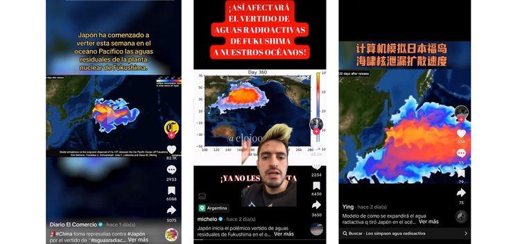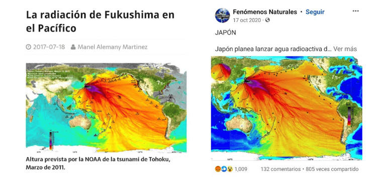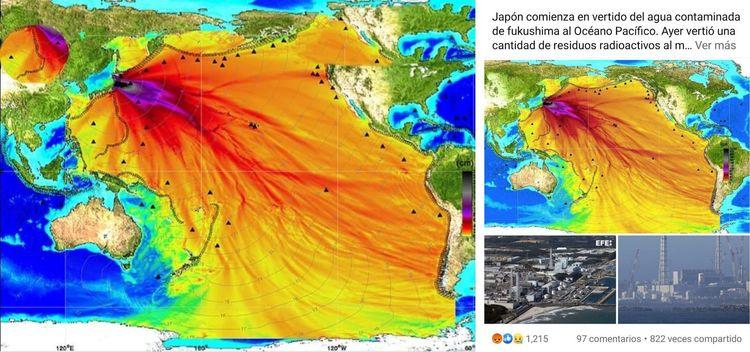 On Facebook or TikTok, accounts that share content related to news or socio-environmental issues have shown graphics that pretend to explain the extent of radiation from mares to other parts of the world. One of them is the one shown below: