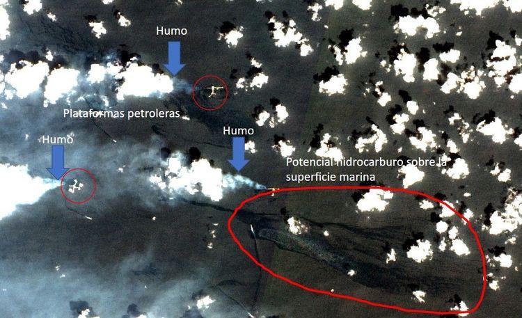 Presence of hydrocarbons detected with Sentinel 2 satellite image (https://scihub.copernicus.es/) obtained on September 24, 2022 on the Campeche Probe. The image distinguishes the oil platforms that are the source of smoke plumes, as well as several black and colored spots that indicate the presence of oil on the surface.