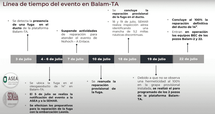 Timeline of attention to the Balam Tango Alpha escape from Pemex. Image: Pemex.