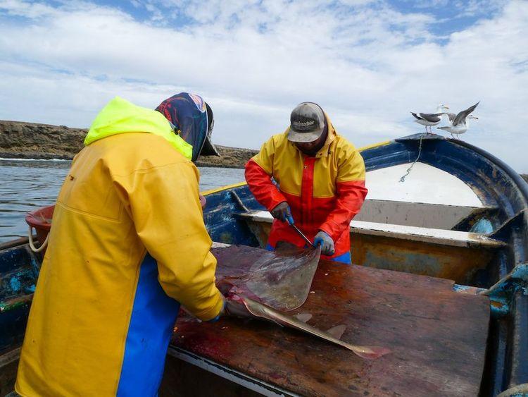 Santiago Villa, Juan Manuel Villavicencio and Jahil Villa, fishermen from the Puerto Chale cooperative in San Juanico using nets to catch guitarfish. Source: Daniela Reyes.
