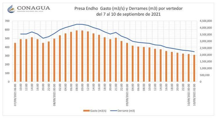 “En la madrugada del martes 7 de septiembre, el caudal estimado que transitó por este río fue del orden de 500 m³/s (metros cúbicos por segundo), de los cuales 150 m³/s provenían de las descargas del Valle de México a través de los túneles Emisor Central y Emisor Oriente, 28 m³/s de río El Salto, 100 m³/s de la descarga de la presa Requena, 130 m³/s del río Tlautla, y 92 m³/s de la cuenca propia entre la salida de los túneles y la ciudad de Tula de Allende”, describe el documento entregado en una reunión de trabajo en Tula y obtenido mediante la Plataforma de Transparencia para esta publicación.