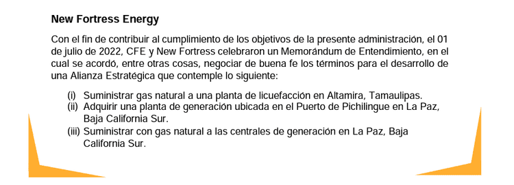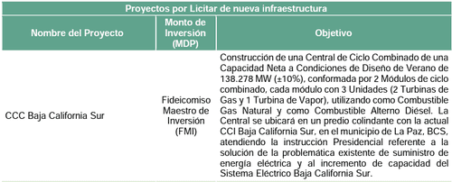 En Baja California Sur, de acuerdo con el informe anual de CFE, los principales proyectos del 2022 fueron la alianza con New Fortres Energy para suministrar las centrales de La Paz con gas natural y la creación de una central de ciclo combinado que funcione con gas.