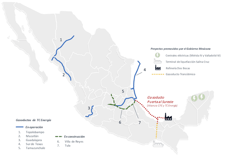Mapeo de los gasoductos de TC Energía. En rojo, el gasoducto Puerta al Sureste. Fuente: TC Energía.