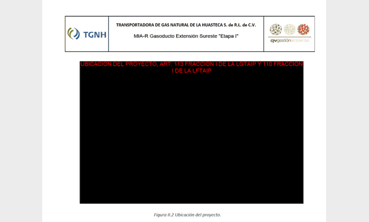 En la Manifestación de Impacto Ambiental (MIA), que es parte de los estudios técnicos para evaluar las repercusiones en el medio ambiente, se encuentra disponible para consulta, pero está dividida en dos (folios 30VE2022G0060 y 30VE2022G0072) y hay información censurada, principalmente imágenes, respecto a temas como el trazo del gasoducto.