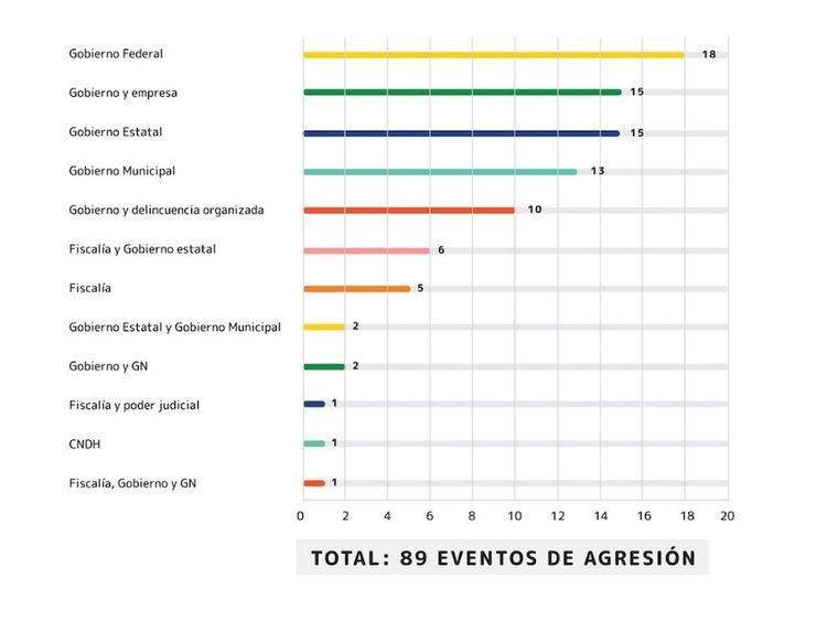 Mientras que los agentes se posicionan como punteros en el registro de presuntos responsables de las agresiones, el informe destaca que 18 eventos de agresión fueron perpetrados por el gobierno federal, 15 por autoridades en relación con empresas y otros 15 por gobiernos estatales.
