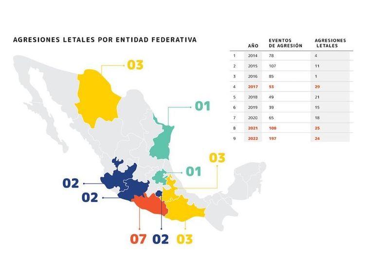 Por su parte, en las catalogadas como agresiones letales, referentes a homicidios, Guerrero se coloca en el primer lugar con siete asesinatos de personas defensoras; seguido por Oaxaca, Puebla y Chihuahua con tres cada uno; y Morelos, Michoacán y Jalisco con dos cada uno.