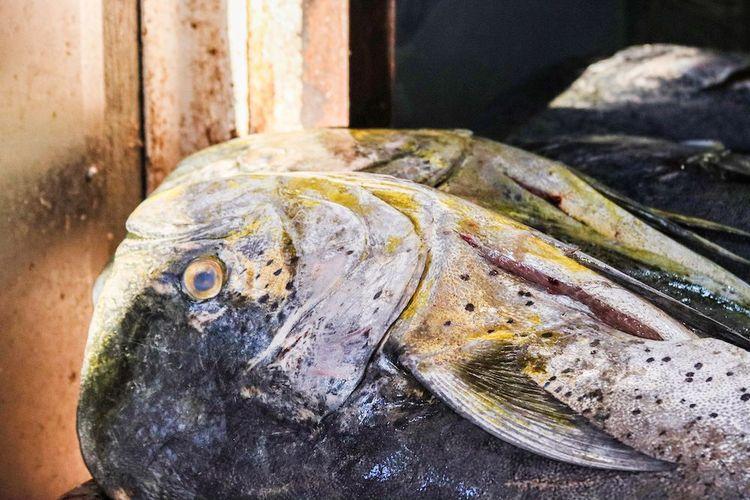Sobre una capa de hielo venden dorado. Estos largos ejemplares han sido traídos de Oaxaca, asegura un vendedor. Es 8 de marzo y el dorado es abundante entre los locales. Este ejemplar que se pesca regularmente en la pesca deportiva se vende aquí bajo el argumento de que ha sido pescado de forma incidental, es decir sin ser la especie objetivo ha resultado en una captura no intencionada.