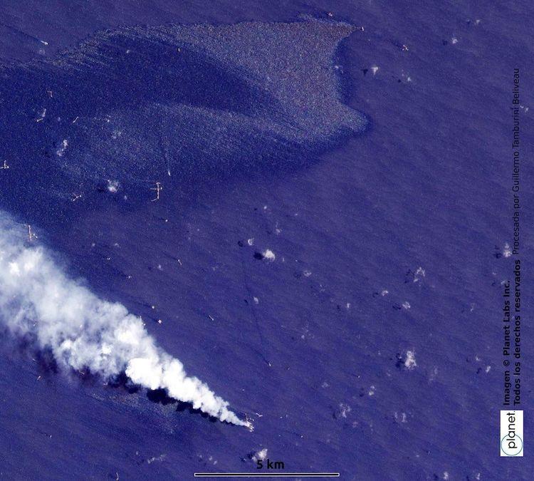 Imagen satelital muestra mancha del derrame en la parte superior. Imagen: Tamburini.